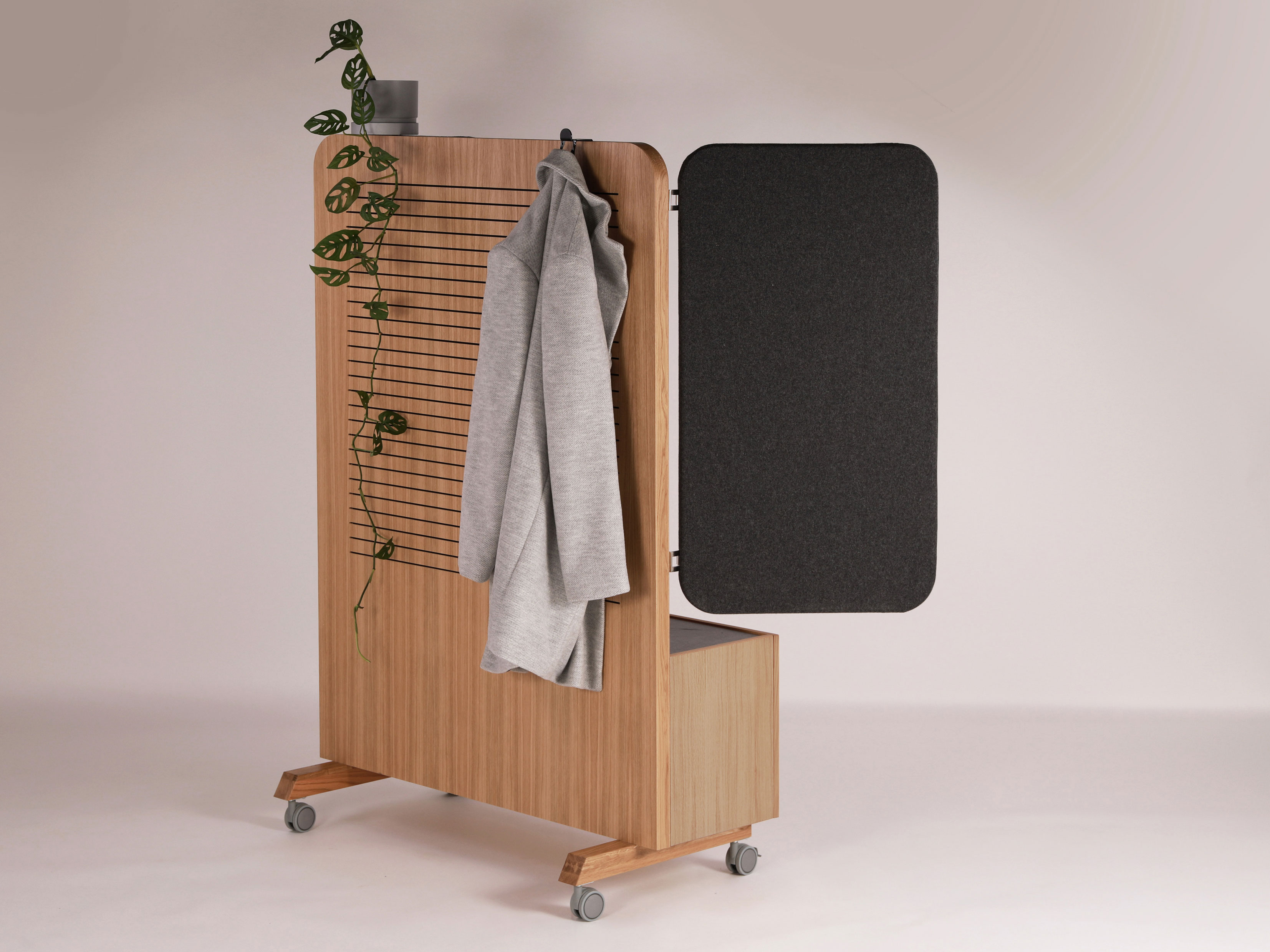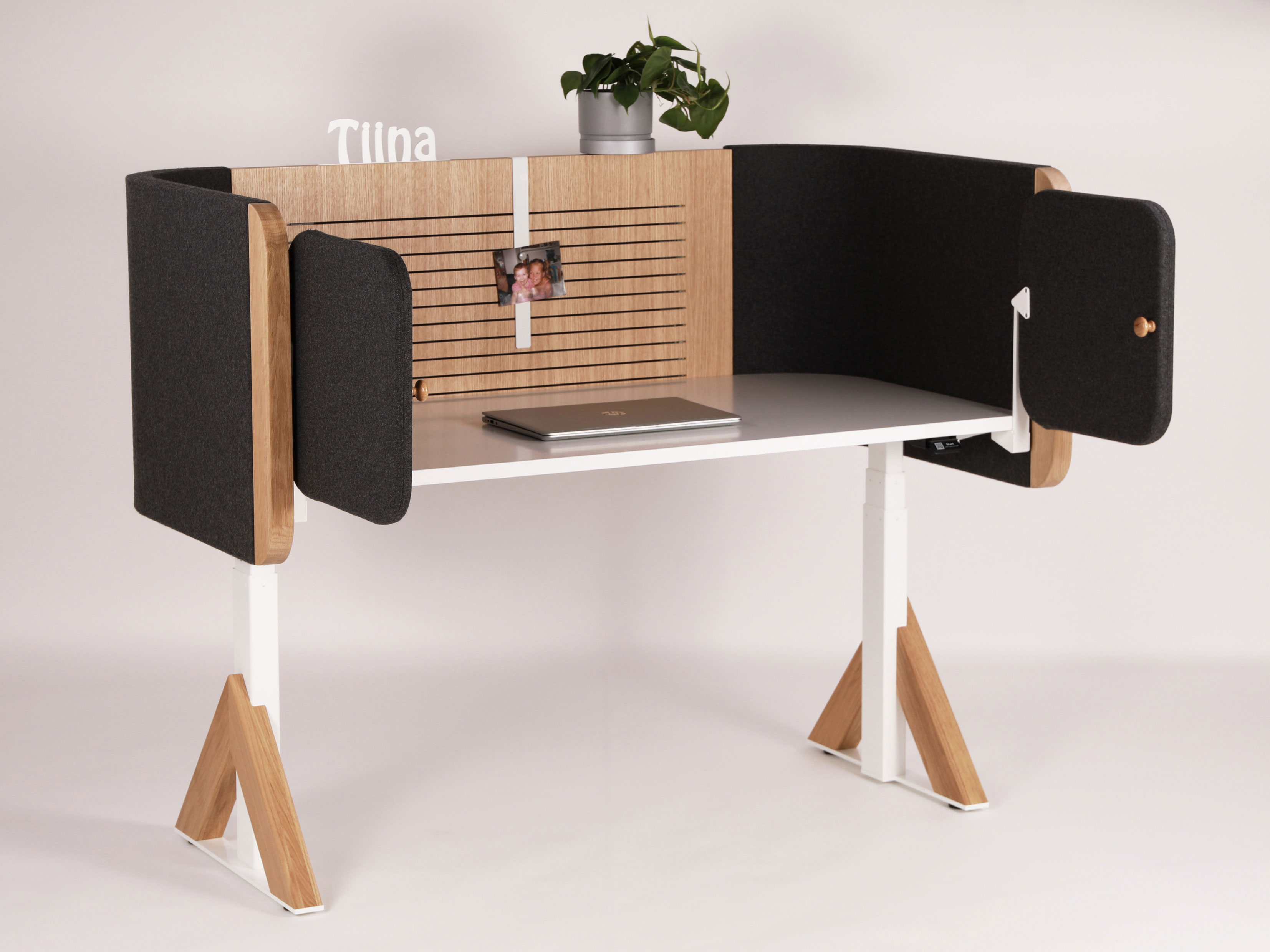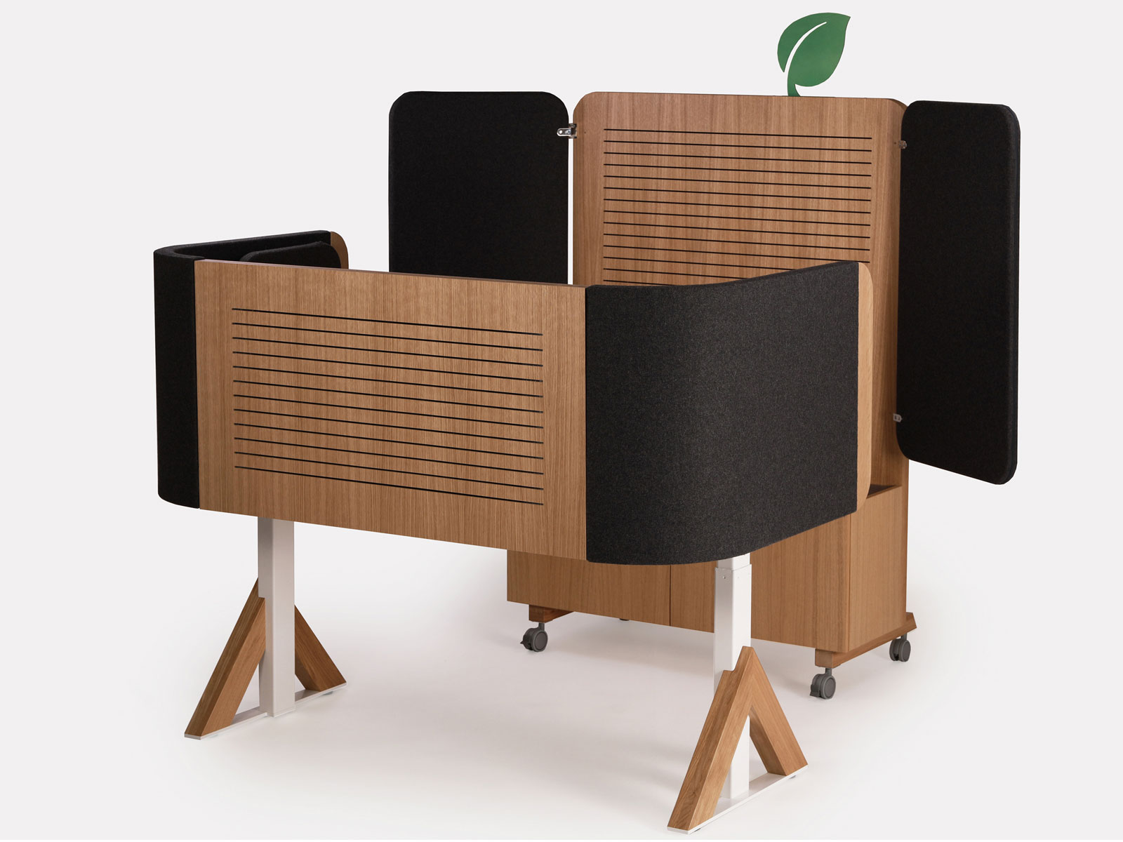 Toimistokalustesarja. Uritettu viilupinnoitettu vaneri, massiivipuu sekä erilaiset stabiilit ja kääntyvät ympäriverhoillut sermielementit luovat akustisesti miellyttävän, suojaisan ja viihtyisän toimistoympäristön, jossa jokainen työpiste on erikseen personoitavissa erilaisilla sarjaan suunnitelluilla lisävarusteilla. Prototyyppi Niemen Tehtaat. 2021.