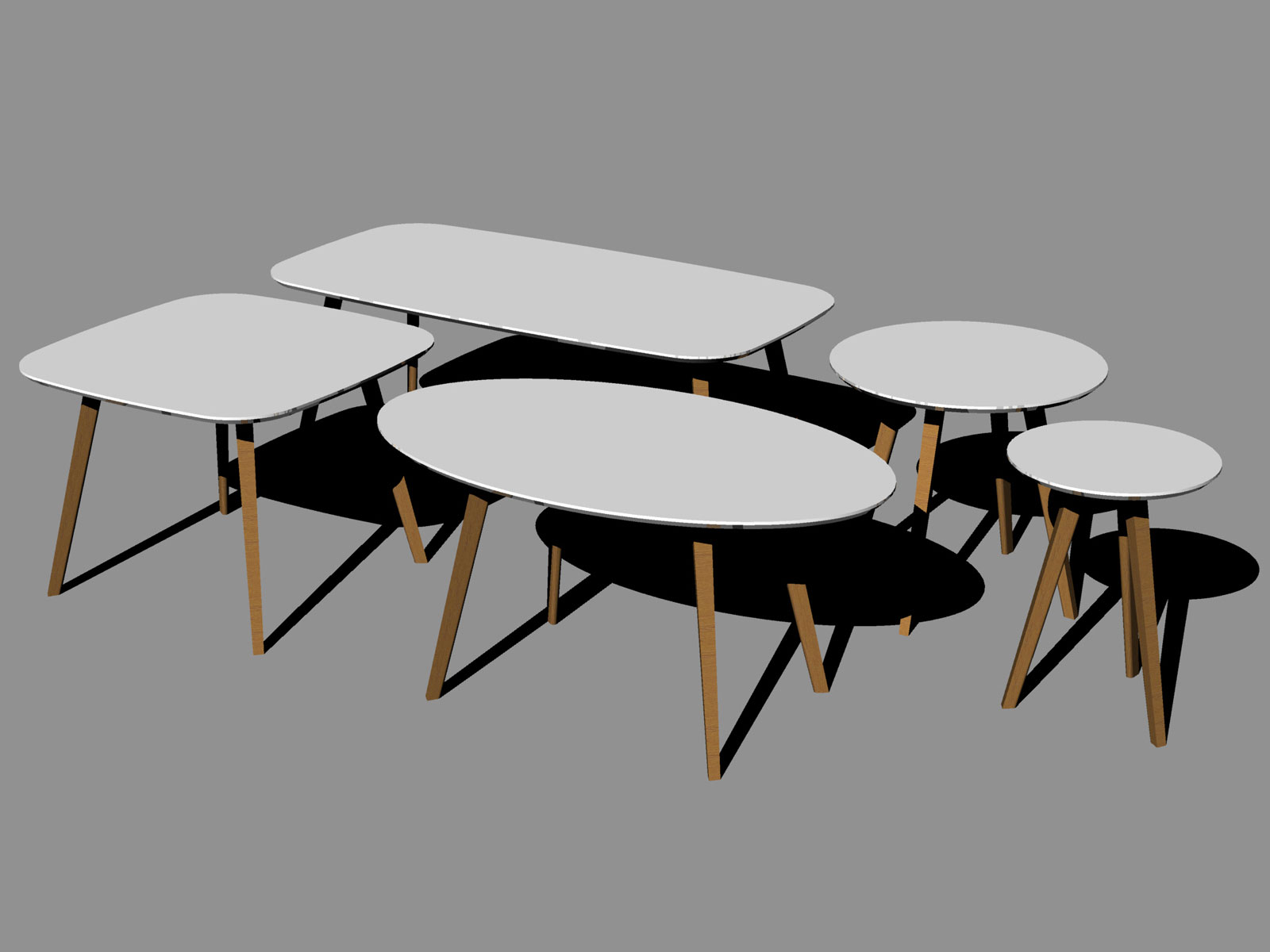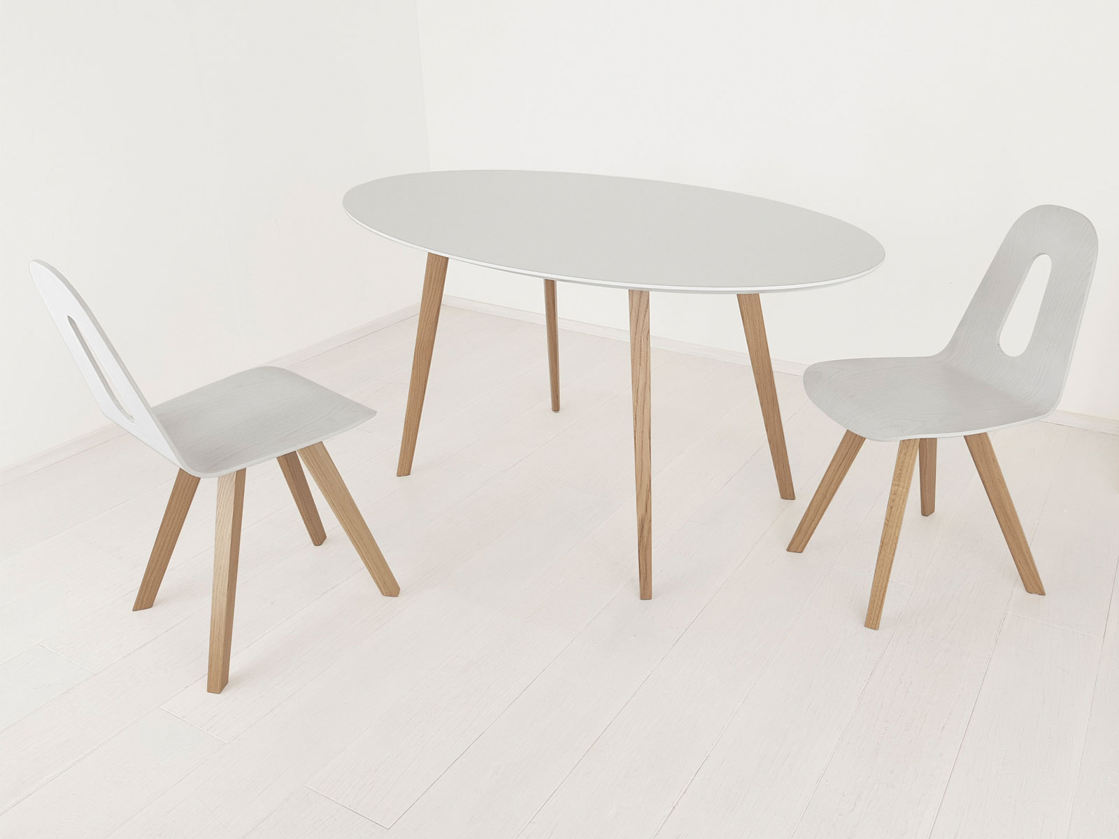 Pöytäperhe massiivipuujaloilla ja useilla kansimuotovaihtoehdoilla. Valmistaja Puulon. 2017.
